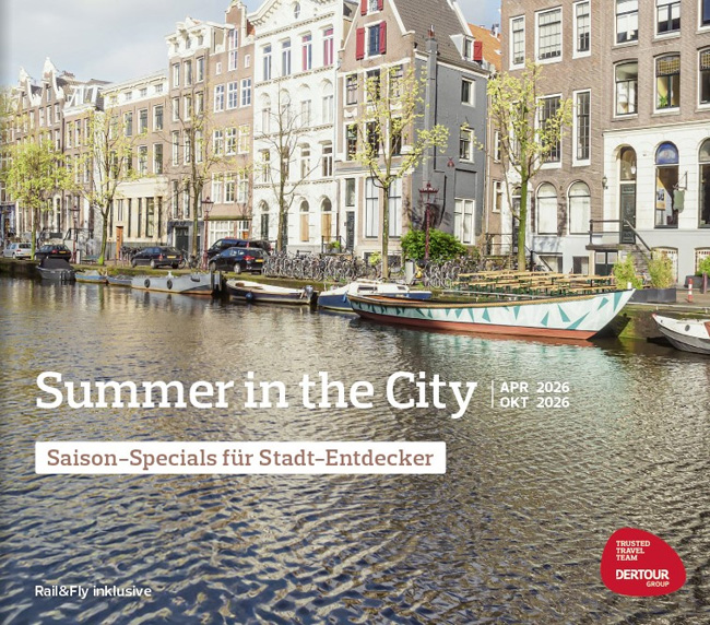 Таким прекрасним ще не був жоден сезон: DERTOUR Städtereisen знову підготував для вас онлайн-каталог «Summer in the City» — зі знижками до 20 % на понад 100 готелів, а також на численні шоу з основного каталогу.